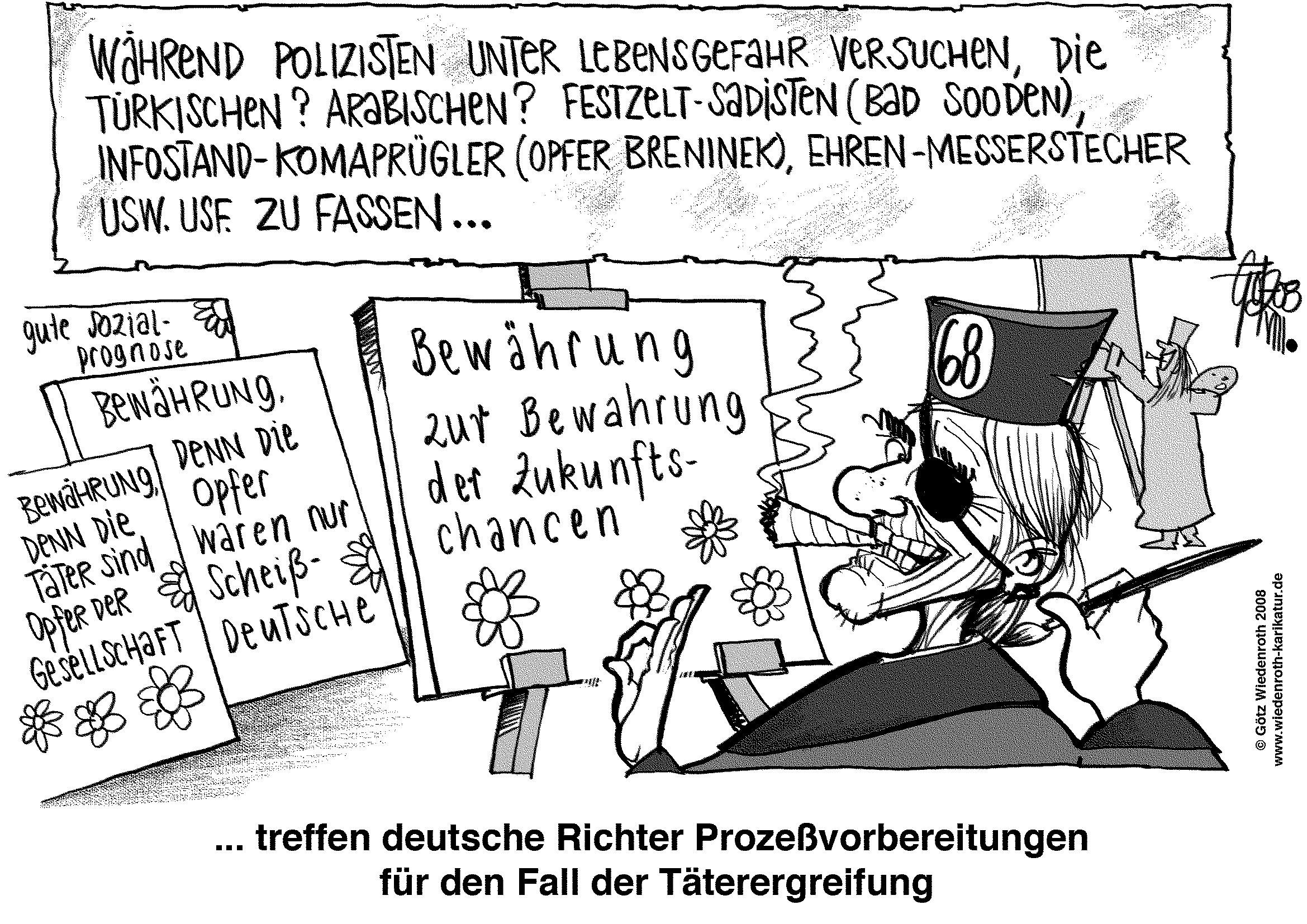- English description: Text in big box: While police tries to catch the turkish? arab? marquee-sadists (Bad Sooden), into-coma-floggers at an electoral information stand (victim Mr Breninek), stabbers-with-honor-motives and so on and so forth ... Caption: ... german judges prepare trial for case of offender's detention. Texts on canvases: suspended sentence in order to preserve life chances in the future, suspended sentence as victims were only shitty germans, suspended sentence as offenders are victims of society, as they have a good social forecast.