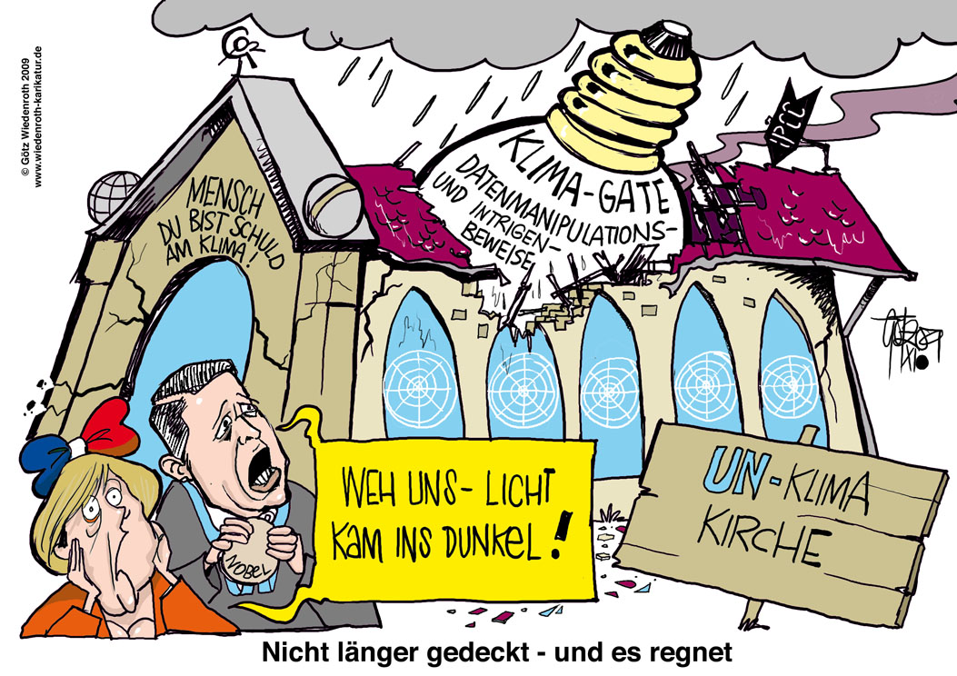 Klima, Klimawandel, Treibhauseffekt, Erwaermung, globale, Merkel, Gore, Kirche, Gluehlampenverbot, Aufdeckung, University, East, Anglia, Climate, Research, Unit, Korruption, Mobbing, Faelschung, Daten, Manipulation, Verschwoerung, Verabredung, Taeuschung, Betrug, Staatsfinanzierung, Steuergeld, Steuerkasse, UNO, IPCC, Nobelpreis, Prognose, Wiedenroth, Karikatur