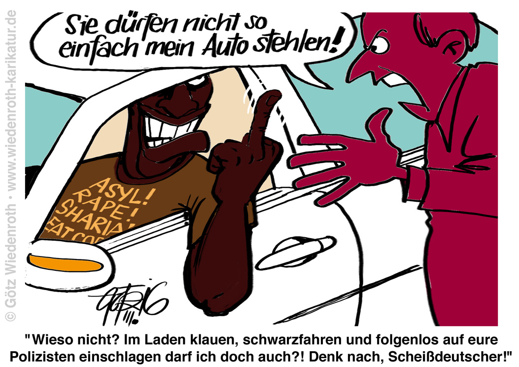Bildunterschrift: "Wieso nicht? Im Laden klauen, schwarzfahren und folgenlos auf eure Polizisten einschlagen darf ich doch auch?! Denk nach, Scheißdeutscher!"![]() |