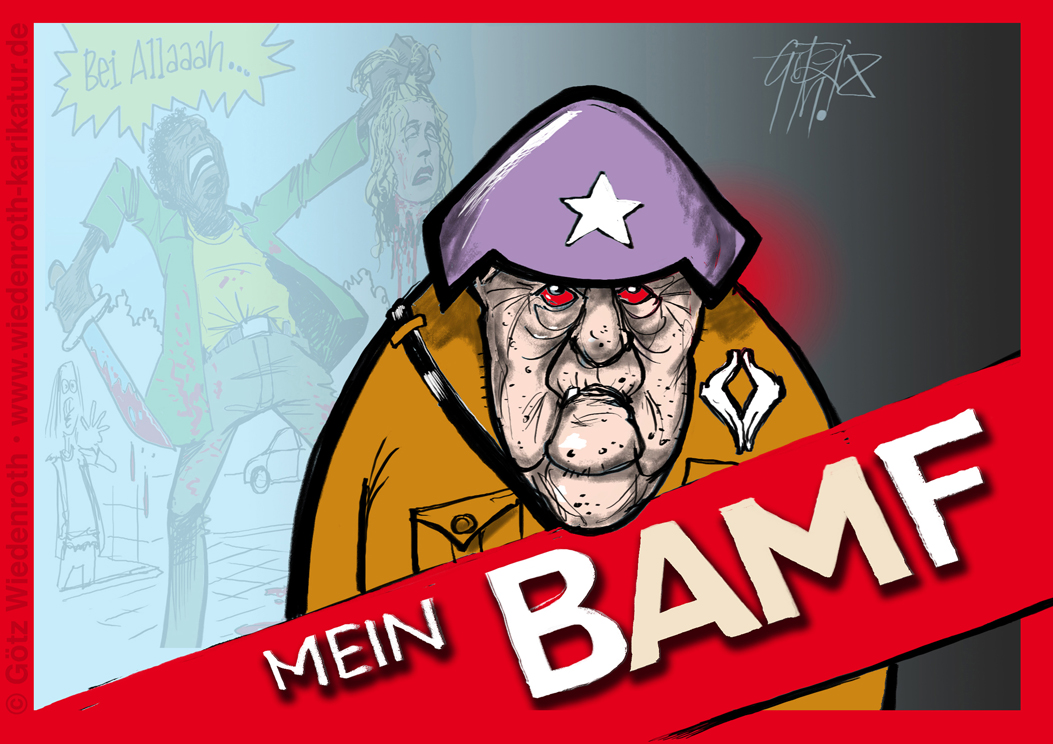 Karikatur vom 04. Juni 2018: Jedem Afrikaner als ERSTgeschenk des deutschen Steuerzahlers zur Schnell-Einbürgerung das Standardwerk der Geliebten Führerin! |