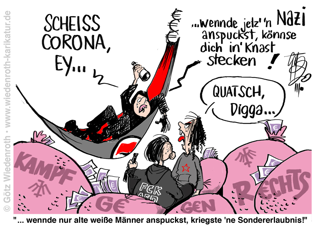 Karikatur vom 20. März 2020: Scheiß Corona, ey. Tröpfcheninfektion durch Schmierlappen: Strafrechtliches Fachgespräch im Sozialraum des Antifa-Schlägersturmbanns. |