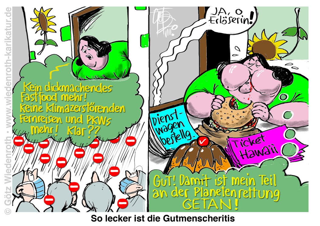 Karikatur vom 10. August 2020: Gutmenschen: Die Last des Gutseins sollen "die Rechten" tragen. Privat darf das grüne Politbüro nach Herzenslust von allem Verbotenen naschen. |