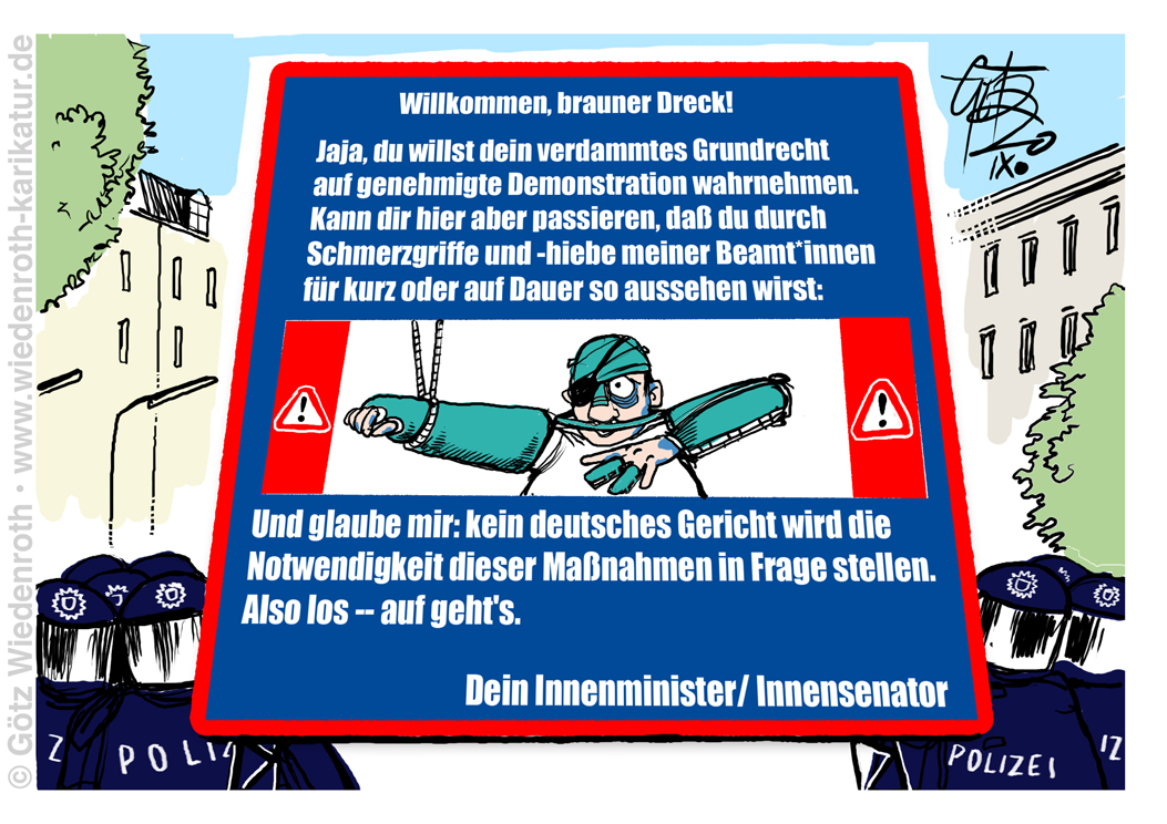 Karikatur vom 29. September 2020: Grundrechte: Polizei jetzt mit praktischen Gefahrenhinweisen für jene rechten Untermenschen, die gegen die Entscheidungen der Regierung demonstrieren. |