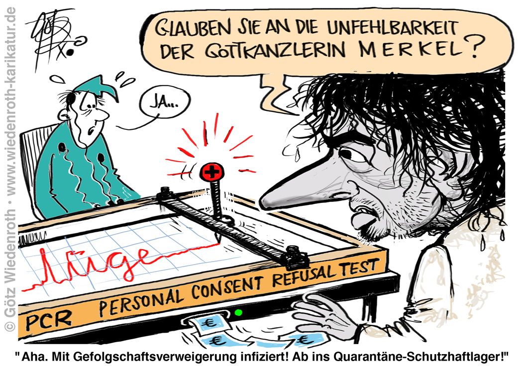 Karikatur vom 21. Oktober 2020: Der Tag scheint nicht mehr fern, ab dem jeder für "infiziert" erklärt wird, der auch nur Rückfragen an das Merkel-Regime hat. |