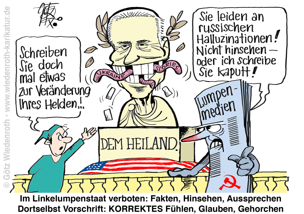 Karikatur vom 23. Oktober 2020: Allein die gefühlte Wahrheit zählt: Dummlinke Lumpenmedien, die den burismatischen Glaubwürdigkeitszerfall ihres Helden Biden wegzensieren. |