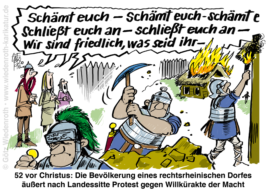 Bildunterschrift: 52 vor Christus: Die Bevölkerung eines rechtsrheinischen Dorfes äußert nach Landessitte Protest gegen Willkürakte der Macht |