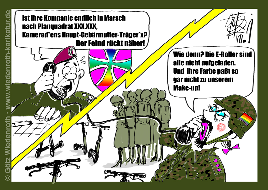 Karikatur vom 09. Juli 2021: Bundeswehr ist sie nur noch dem Namen nach: Soldat mit Deppenmaske, Feldanzug und Rucksack marschiert durch die Stadt -- auf einem Elektroroller. |