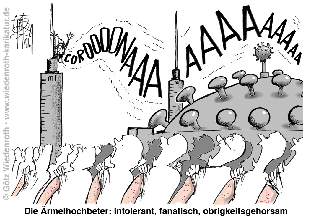 Karikatur vom 24. August 2021: Penetrant plärrt die Stimme der Corona-Vorbeter von den Medien-Minaretten. Bilder aus einem untergehenden, ehemals aufgeklärten Land. |