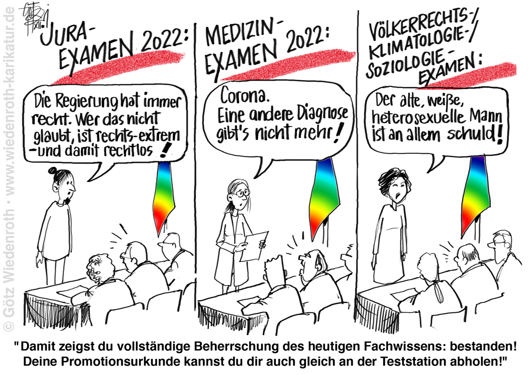 Karikatur vom 31. Dezember 2021: Der totalitäre, dogmatische Linkelumpenstaat zeigt, was er kann: radikale Verkürzung der Regelstudienzeit bis zum Examen und zum Doktortitel. |