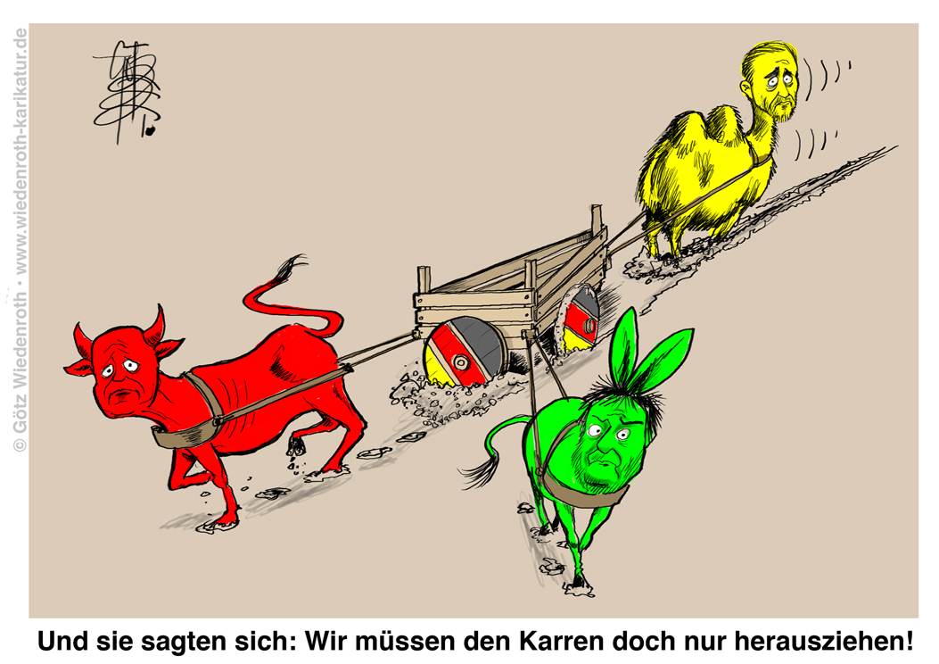 Karikatur vom 28. Januar 2022: Klima-, Asyl-, Gender-, Europa- und Coronasozialismus: Den Niedergang in seinem Lauf/ halten Ochs', Esel und Kamel nicht auf! |