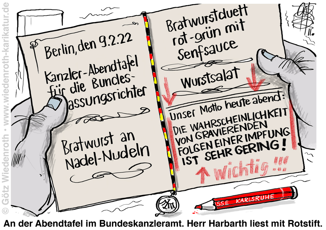 Karikatur vom 11. Februar 2022: Beschlüsse des harbarthierten Bundesverfassungsgerichts: Anscheinend nicht eine Sache der Rechtsanwendung, sondern der rustikalen Kulinarik. |