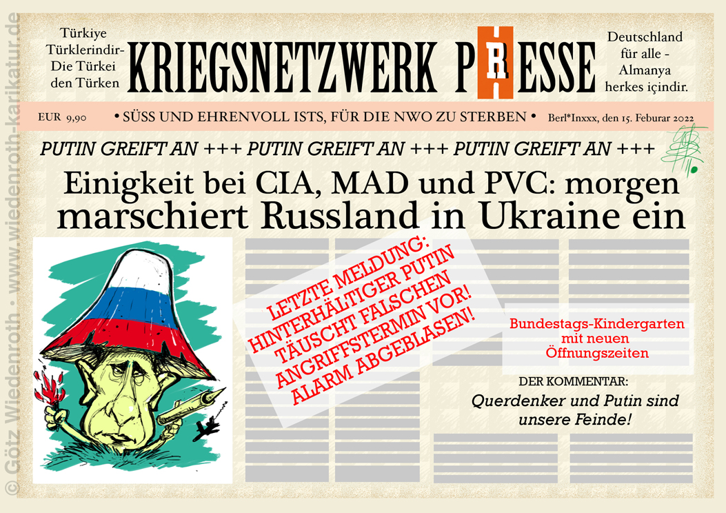 Karikatur vom 16. Februar 2022: Erst. Einigkeit bei CIA, MAD und PVC: morgen marschiert Russland in die Ukraine ein. Dann. Verrat: Putin hat falschen Termin vorgetäuscht! |
