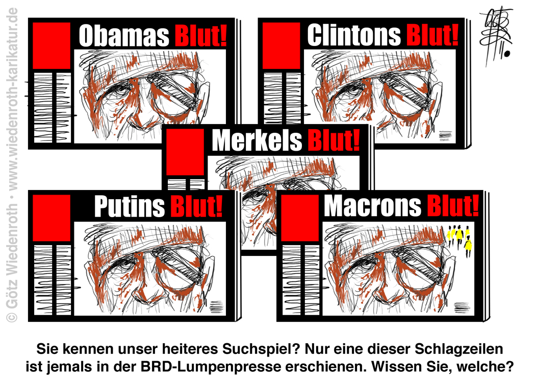 Bildunterschrift: Sie kennen unser heiteres Suchspiel? Nur eine dieser Schlagzeilen ist jemals in der BRD-Lumpenpresse erschienen. Wissen Sie, welche? |
