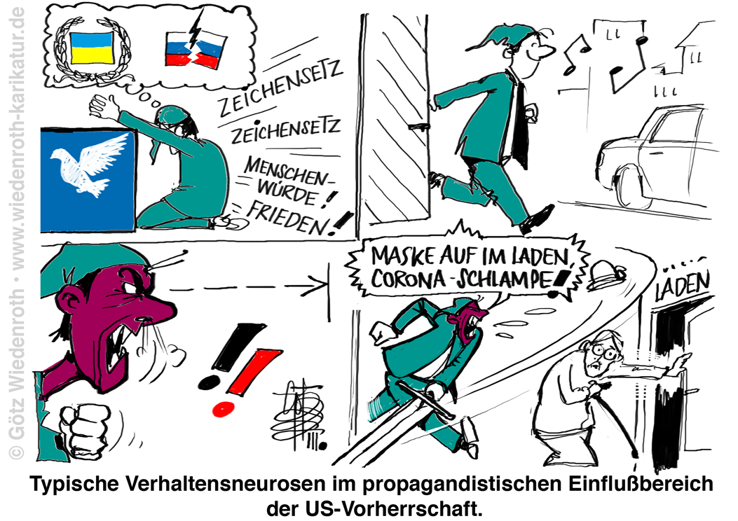 Karikatur vom 31. März 2022: Ihre penetrante Zeichensetzerei für Frieden in der Ukraine hindert die Gutmenschen nicht, Krieg zu führen (gegen Ungeimpfte, Klimaverweigerer usw.) |