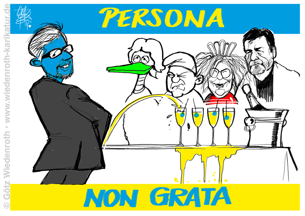 Karikatur vom 12. April 2022: Der Botschafter eines US-Marionetten-Frontstaates, akkreditiert in einem US-Marionettenstaat, darf sich beliebig über das diplomatische Parkett flegeln. |