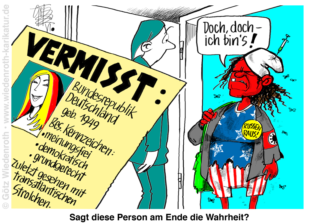 Karikatur vom 02. Juni 2022: Vermißt: Bundesrepublik Deutschland, geboren 1949, besonderes Kennzeichen Meinungsfreiheit, zuletzt gesehen mit transatlantischen Strolchen. |