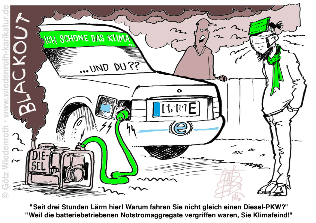 Bildunterschrift: "Seit drei Stunden Lärm hier! Warum fahren Sie nicht gleich einen Diesel-PKW?" "Weil die batteriebetriebenen Notstromaggregate vergriffen waren, Sie Klimafeind!" |