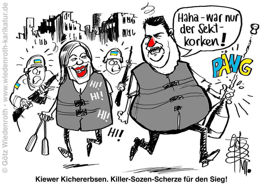Karikatur vom 28. Juli 2022: Zum Sektschlürfen und Kichern in die deutsche Botschaft nach Kiew. Wermutstropfen: Pflicht-Betroffenheitsgetue in Schutzweste vor Hausruinen. |
