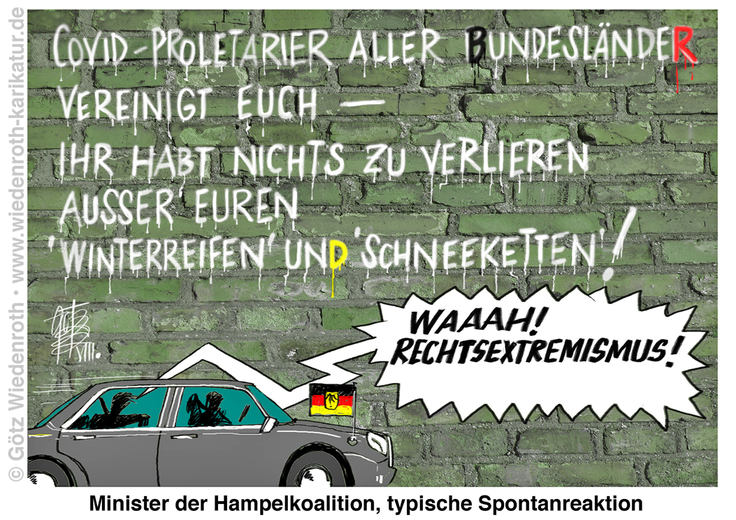 Karikatur vom 04. August 2022: Winterreifen und Schneeketten stiften bei sichtbarem Schnee evaluierbaren Nutzen. Sind daher als Metapher für wahnhafte Covid-Maßnahmen ungeeignet. |