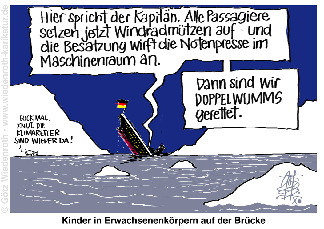 Karikatur vom 11. Oktober 2022: Die Passagiere auf dem falschen Dampfer mit irgendwas beschäftigen: psychedelische Windrad-Hypnose und infantile Doppelwumms-Durchsagen. |