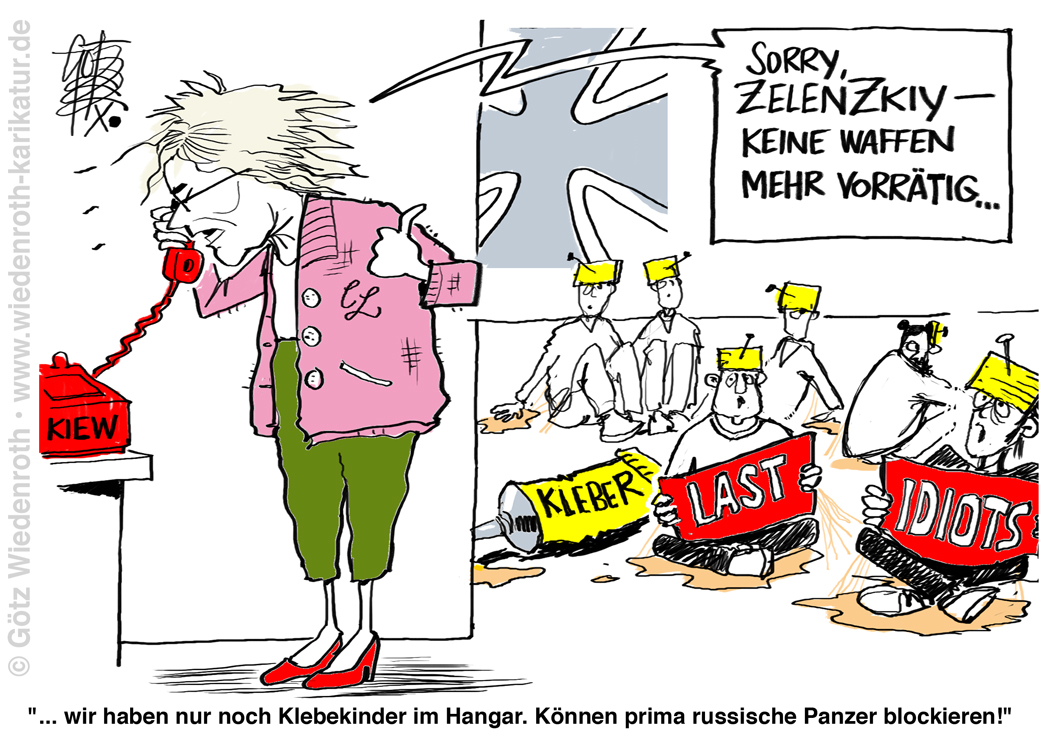 Karikatur vom 21. Oktober 2022: Bundeswehrwaffen alle gen Kiew verfrachtet. Deutsche Landesverteidigung steht nicht nur mit leeren Magazinen, sondern auch ohne Hosen da. |