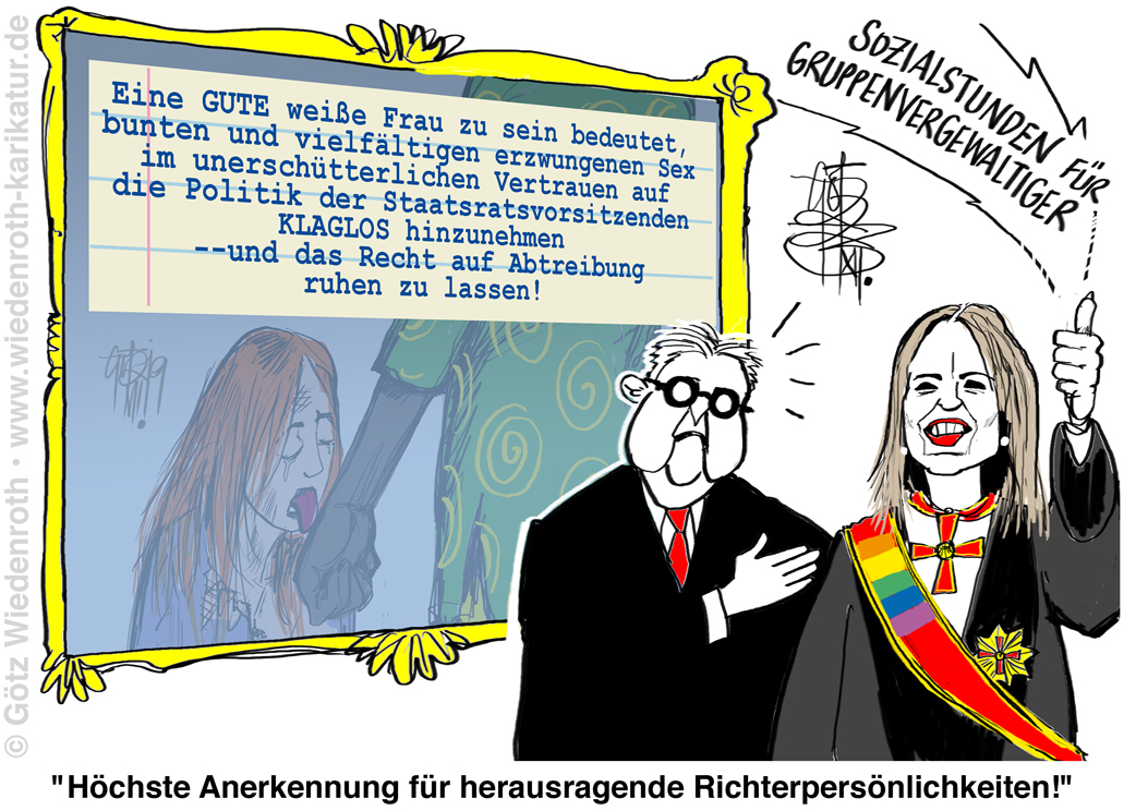 Karikatur vom 04. Dezember 2023: Sozialstunden für Gruppenvergewaltigung. Ein richterliches Urteil, das nur noch durch Verleihung des BunTesverdienstkreuzes gewürdigt werden kann. |