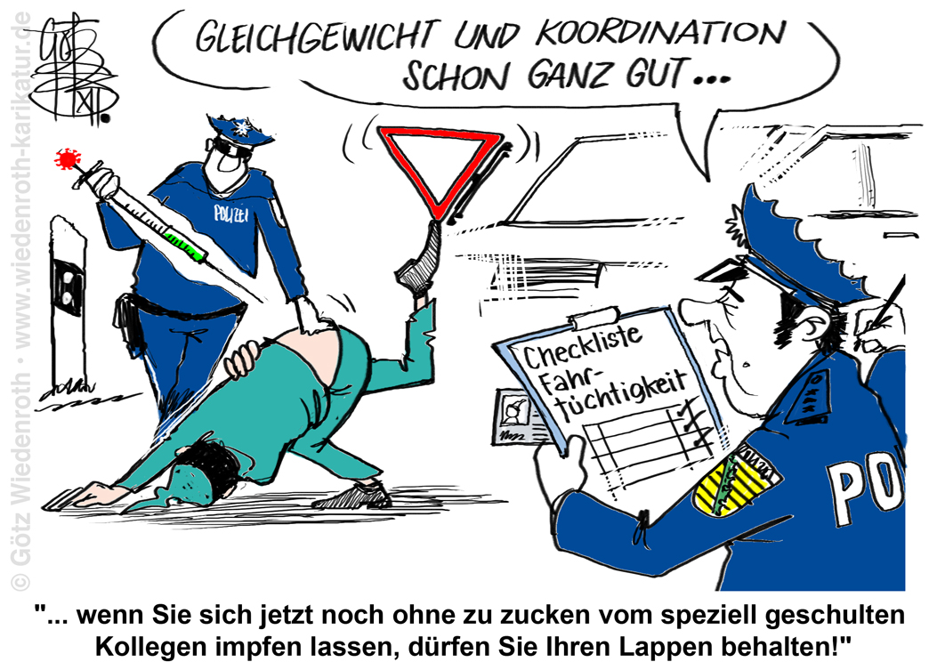 Bildunterschrift: "Schon ganz gut! Wenn Sie jetzt noch die Impfspritze ohne zu zucken hinnehmen, dürfen Sie Ihren Lappen behalten!" |