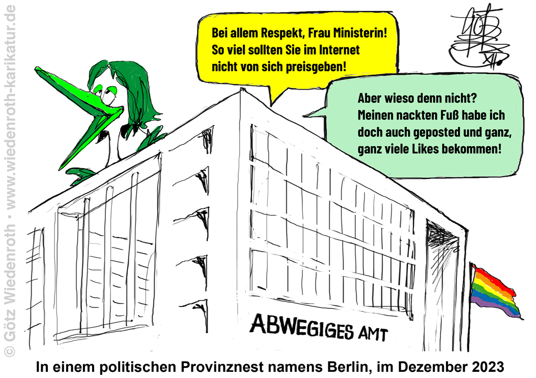 Karikatur vom 15. Dezember 2023: Aspekte abwegiger Außenpolitik: Wer politisch und intellektuell nichts zu bieten hat, wird mit der fotografischen Mitteilung eigener Körperteile auftrumpfen. |