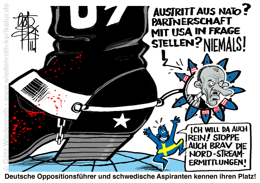 Karikatur vom 06. Februar 2024: Vasallen-Etikette: Nato-Austritt bekämpfen, um im politischen Geschäft zu bleiben. Nord-Stream-Ermittlungen beenden, um Nato-Staat zu werden. |