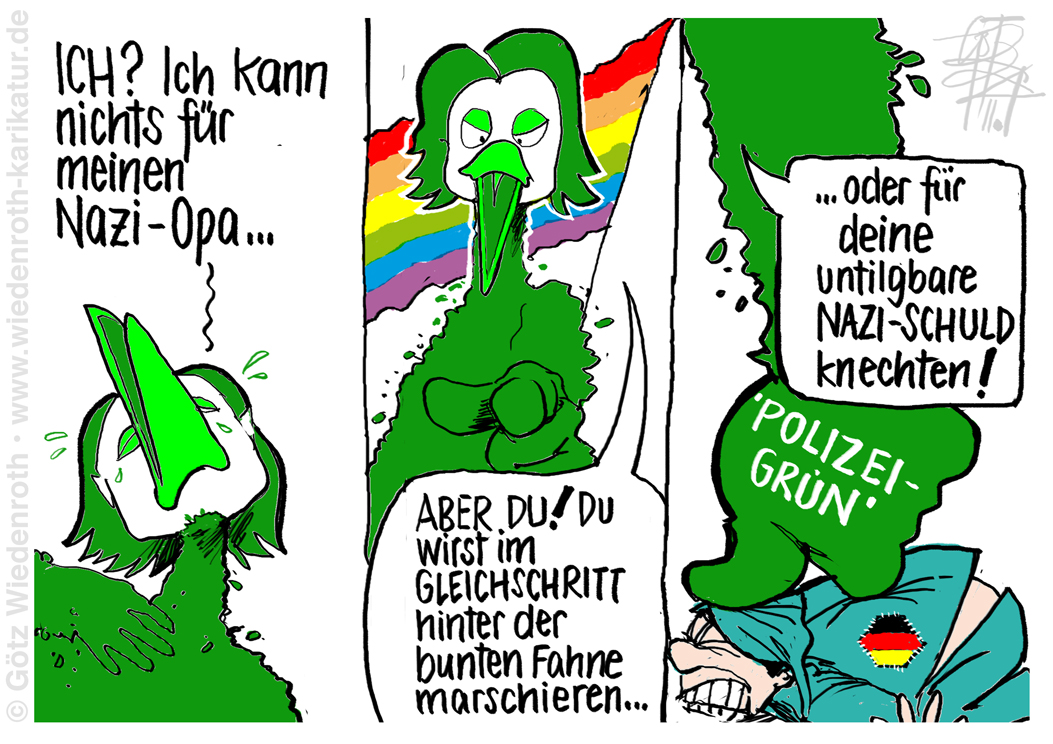 Karikatur vom 15. Februar 2024: Die Schuld der Großväter und Urgroßväter -- den heute Lebenden politisch zuzuschreiben. Den Politiker*in*inninen der guten Seite natürlich nicht. |