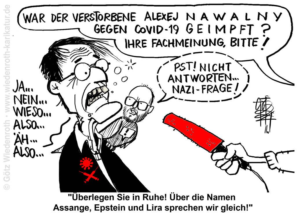 Karikatur vom 19. Februar 2024: Wie in Orwells "1984". Die "Zwei-Minuten-Haß-Sendung" heißt 2024 "Nawalny-Gedächtnis-Ritual". Wehe dem, der sich nicht genügend haßerfüllt zeigt. |
