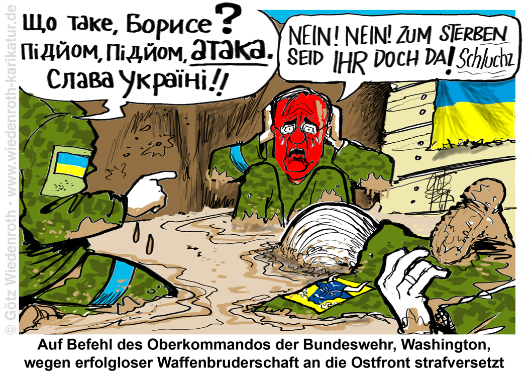 Karikatur vom 22. Februar 2024: "Unterstützung für die Ukraine". Große Klappe von weitem auf dem sicheren Politikersessel. Ganz kleinlaut im Schützengraben in Blut und Schlamm. |