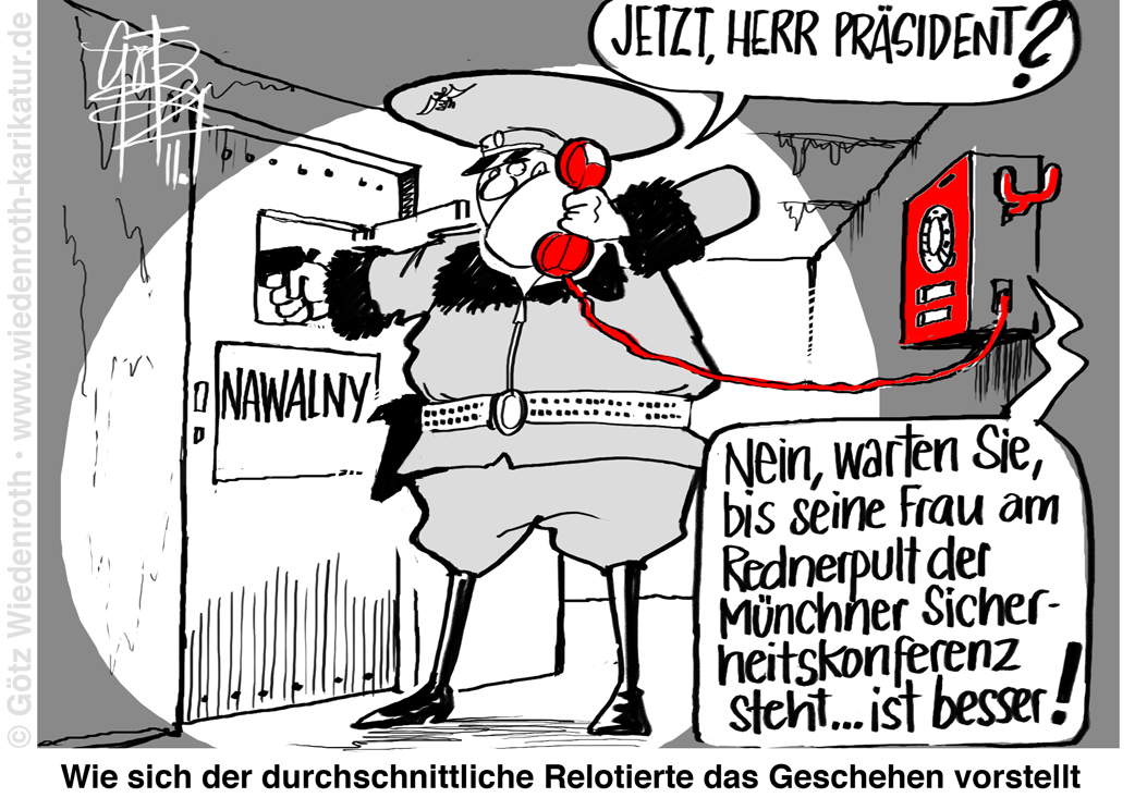 Karikatur vom 28. Februar 2024: Jeder Dummkopf kann sehen, daß der Tod des A. Nawalny nur den Gegnern Putins nützt. Schwerster Fehler in Kriegszeiten: den Gegner für dumm zu halten. |