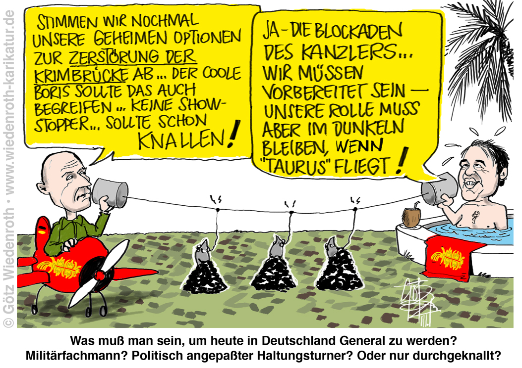 Karikatur vom 05. März 2024: Bundeswehr 2024: Generale am Blechdosentelefon erörtern im Plauderton eine halbstündige Ministerpräsentation zu "Taurus"-Kriegsakten gegen Rußland. |