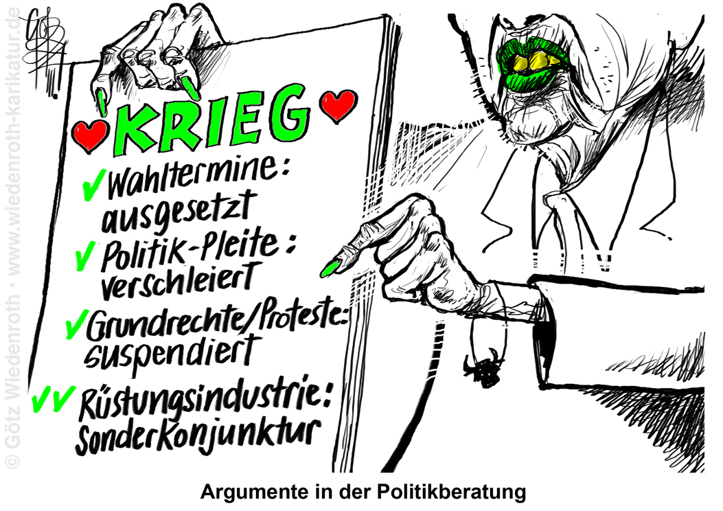 Karikatur vom 26. März 2024: Krieg ... bis auf weiteres keine Wahlen mehr? ... desaströse Folgen der Politik verschleiern? ... Proteste mit Kriegsrecht unterbinden? ... hmm. Hm-hm-hm. |
