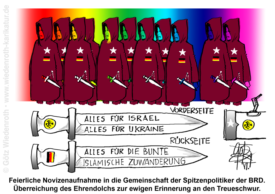 Bildunterschrift: Feierliche Novizenaufnahme in die Gemeinschaft der Spitzenpolitiker der BRD. Überreichung des Ehrendolchs zur ewigen Erinnerung an den Treueschwur. ![]() ![]() |
