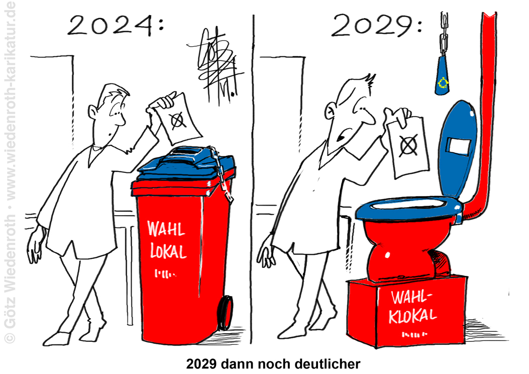 Karikatur vom 10. Juni 2024: Im Wahllokal dient (!) eine 240-Liter-Mülltonne mit Deckelschlitz als Wahlurne. Deutlicher ist nicht zu machen, was die Wählerstimme in der EUdSSR wert ist. |