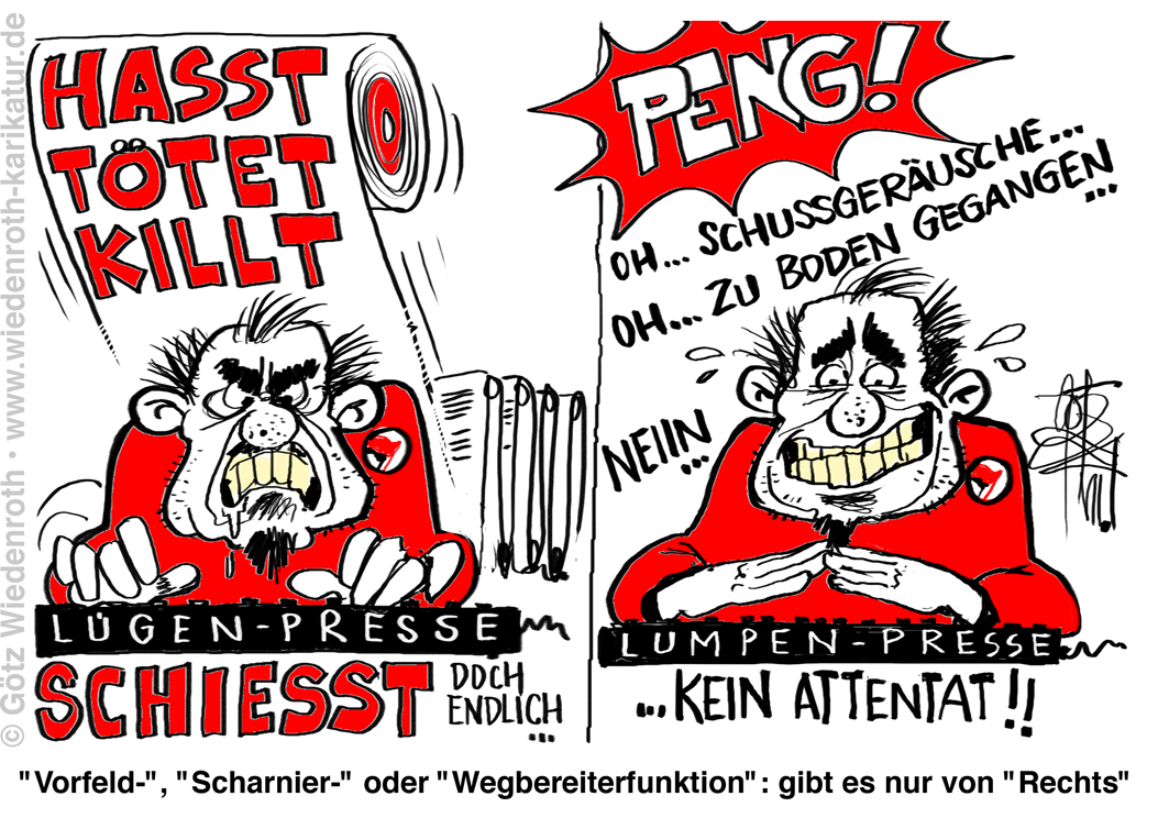 Karikatur vom 19. Juli 2024: Wer hat das Attentat auf Trump förmlich herbeigeschrieben? Welche Hass-Journalisten haben mitgeschossen? Und wer spielte danach alles herunter? |