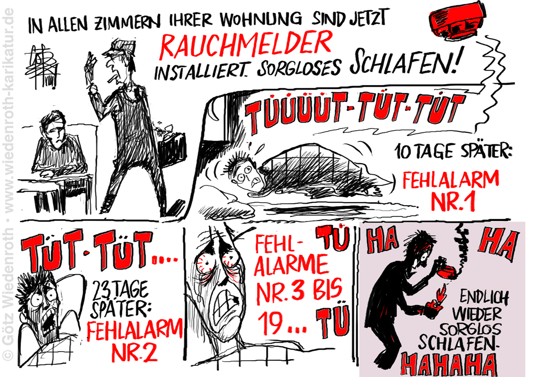 Karikatur vom 07. August 2024: Sorglos schlafen, geschützt durch moderne Rauchmelder-Technik? Regelmäßig aus dem Schlaf gerissen werden durch wiederkehrende Fehlalarme! |
