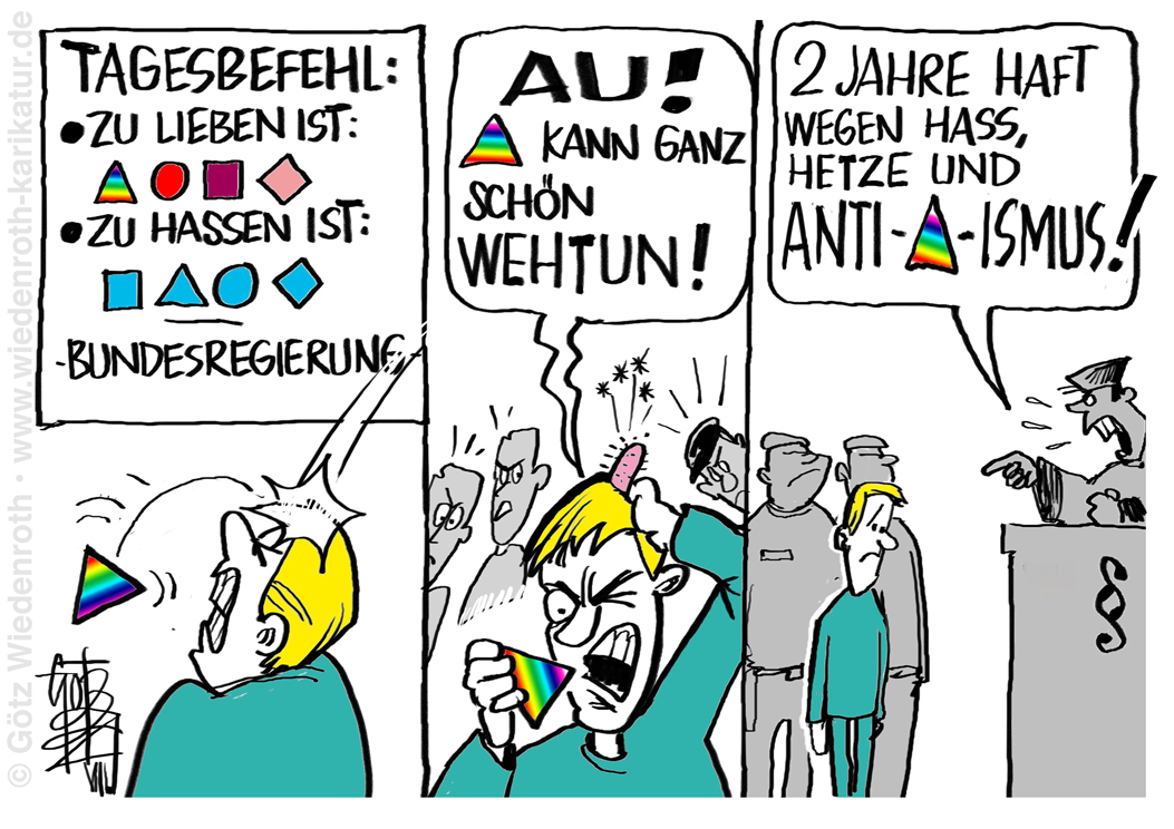 Karikatur vom 13. August 2024: Wer ständig "Hass und Hetze" kreischt, will zwingend vorschreiben, was bedingungslos zu lieben ist. Wehe, wenn ein Staat Gefühle reguliert. |