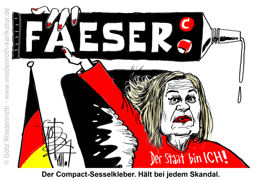 Karikatur vom 15. August 2024: Faesers Verbot des "Compact"-Magazins gerichtlich bis auf weiteres beendet. Die Verfassungsministerin braucht Verfassungsnachhilfe -- aber nicht im Amt. |