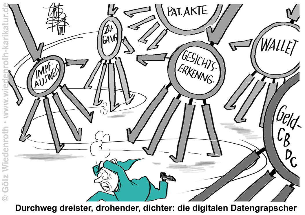 Karikatur vom 29. August 2024: Bürgerausspähung. Was technisch machbar ist, wird auch gemacht. Nach einer kleinen Schamfrist, in der man wortreich vor dem "gläsernen Bürger" warnte. |