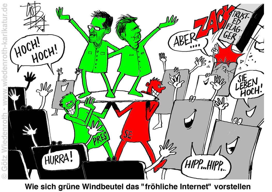Karikatur vom 09. Oktober 2024: "Trusted Flagger": linksradikale, steuerfinanzierte Anschwärzer des grünen Vertrauens. Aus dem Netz tilgen, was nicht grünenfreundlich ist. |