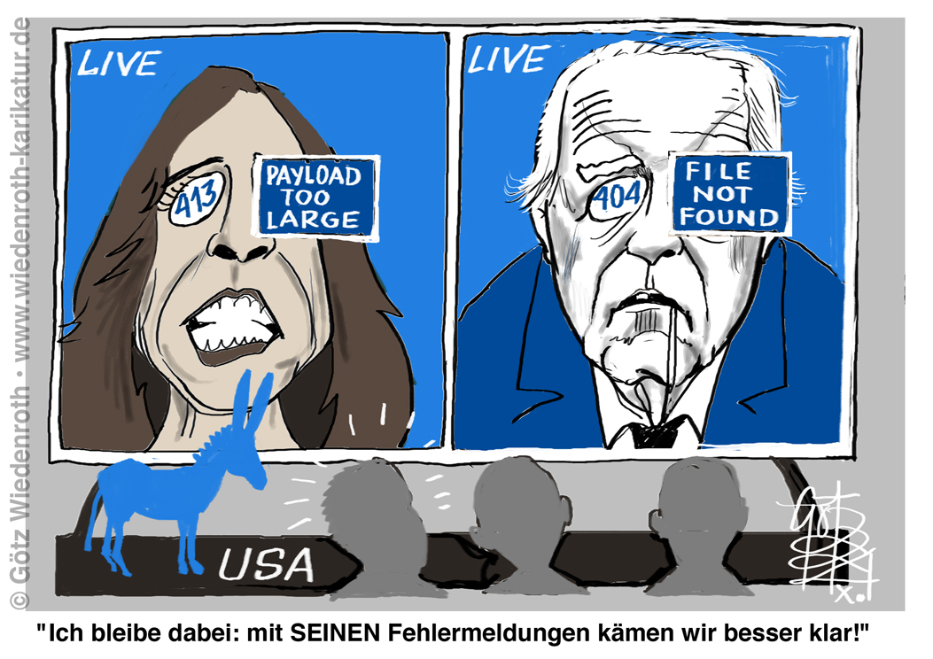 Karikatur vom 17. Oktober 2024: Die politischen Betriebssysteme "Harris" und "Biden" im Vergleich. Bei beiden ständig Bluescreen-Ereignisse, aber unterschiedliche Fehlercodes. 404, 413. |
