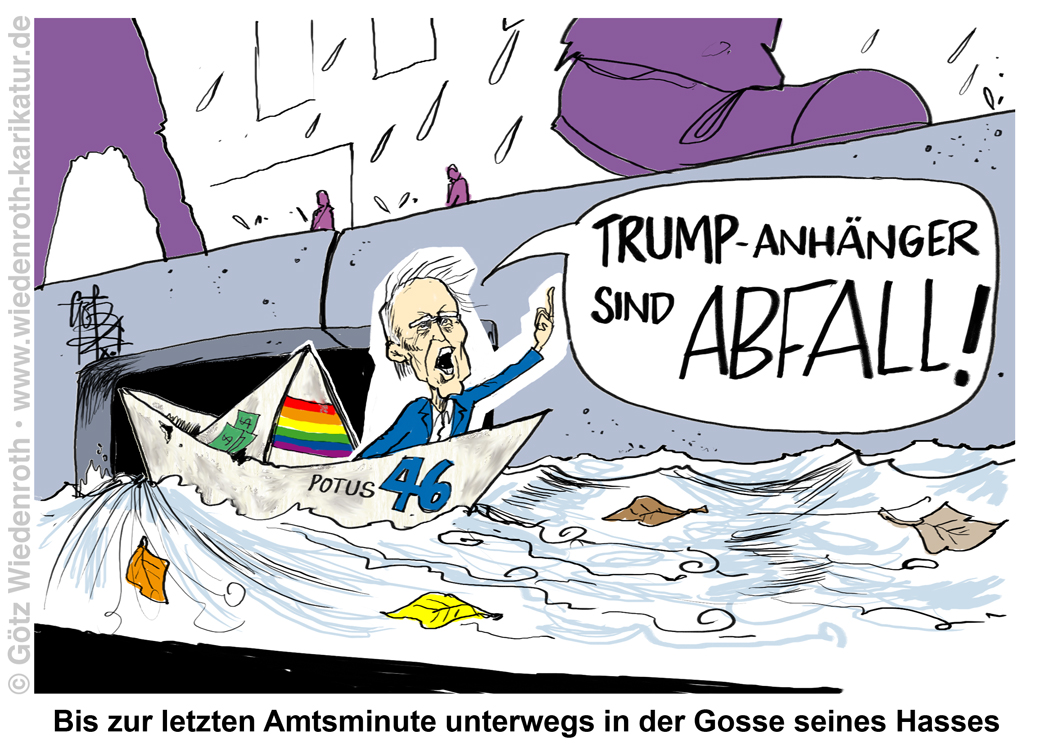 Karikatur vom 31. Oktober 2024: USA: Jener Greis, 2021 von der deutschen Lumpenpresse als "nationaler Versöhner" gefeiert, bezeichnet heute Teile seiner Bevölkerung als Abfall. |