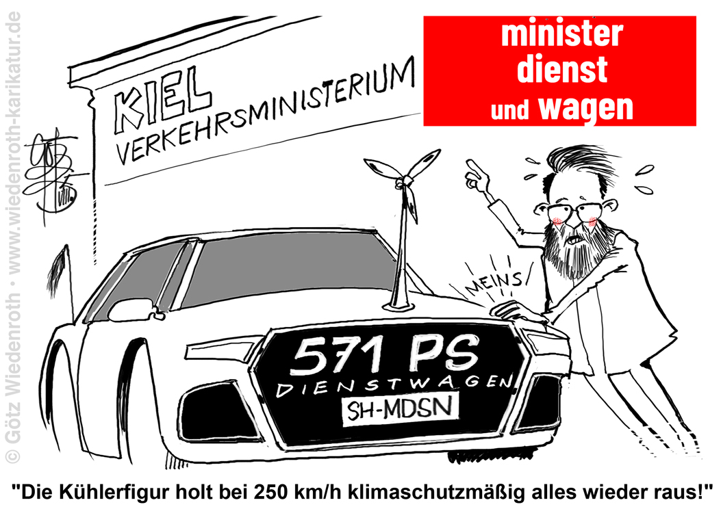 Karikatur vom 09. August 2025: Ministerleins Triebdurchbruch. Neuer Dienstwagen her und mal so richtig in die Vollen. Mit 571 PS, Abgas-Soundklappen, Klimaanlage und Klimaschutzanlage! |