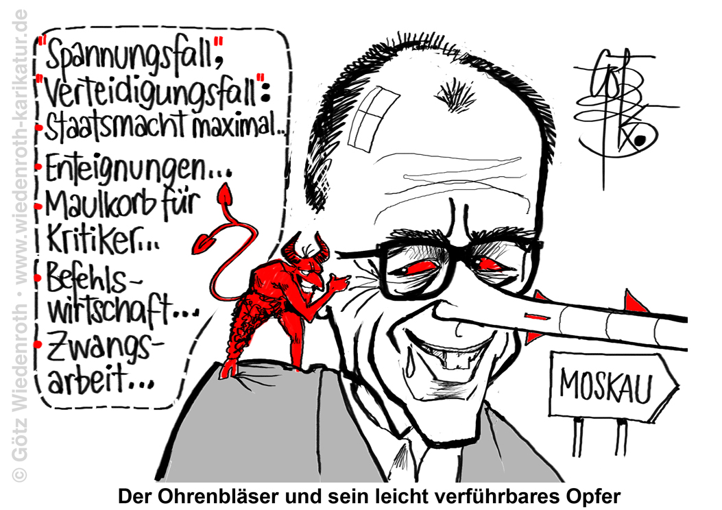 Karikatur vom 01. Oktober 2025: Abstürzende Zustimmungsraten? Verheerende Kassenlage? Unübersichtliche Querfronten? Wie, wie gelegen käme da der "Spannungsfall" mit Moskau! |