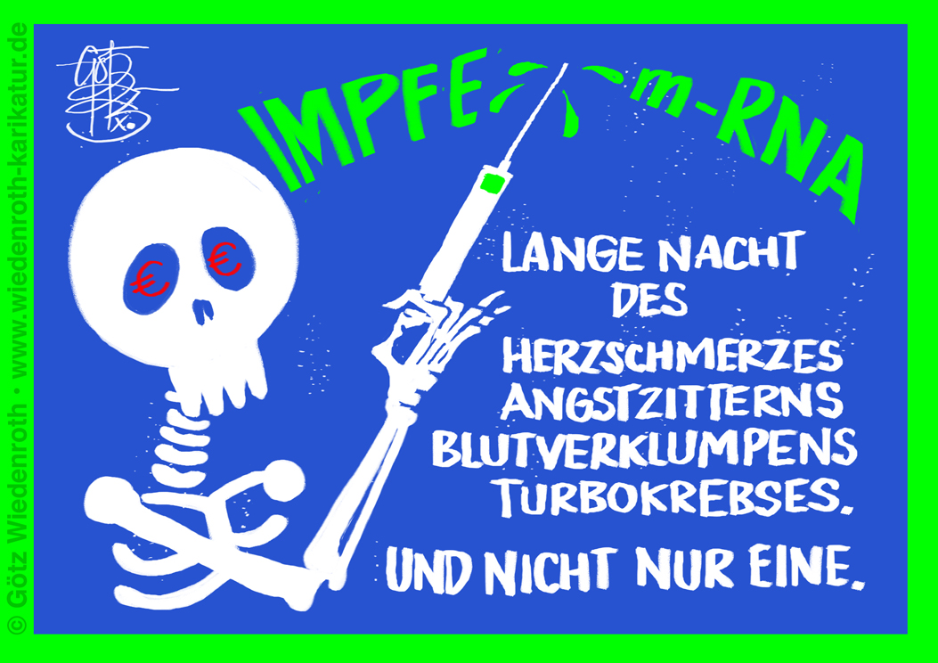 Karikatur vom 14. Oktober 2025: Die Agonie der Rechtsstaatlichkeit erkennt man daran, daß mit einer "Langen Nacht des Impfens" Kasse gemacht wird, statt Coronaaktivisten abzuurteilen |