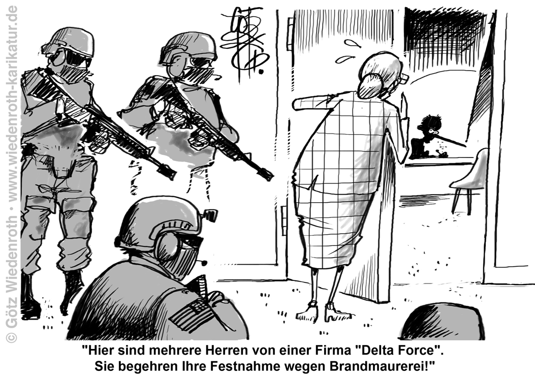 Bildunterschrift: "Hier sind mehrere Herren von einer Firma 'Delta Force'. Sie begehren Ihre Festnahme wegen Brandmaurerei!" |