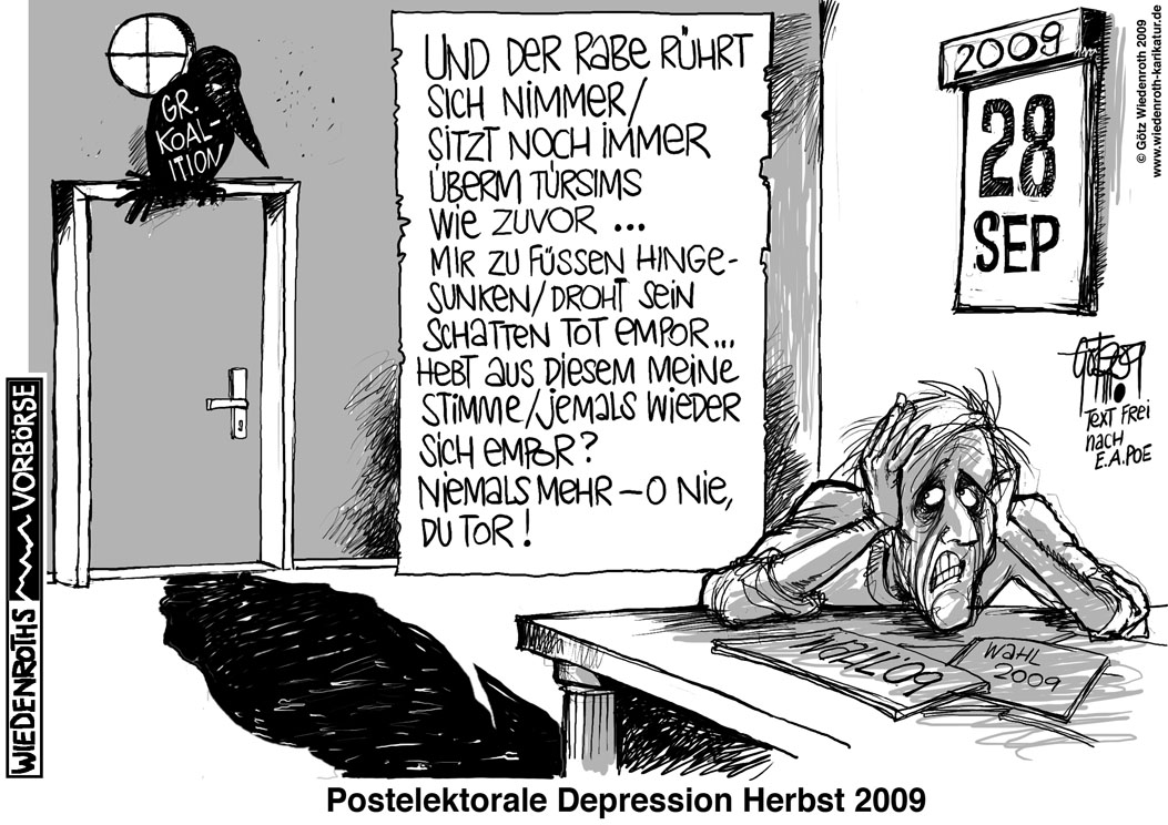 • English description: Nightmare grand coalition in federal government formed by christian and social democrats. Both partners block each other since four years. The hope this coalition would solve the big problems of this land with united political power was bitterly disappointed. On the contrary they were both so eager not to set their specific voters into rage that effectively no problem-solving decision was made, not to mention those that made life more expensive and bureaucratic. Nobody needs, nobody really wants this coalition. Regrettably according to current opinion polls election arithmetics could happen to bring this coalition into power again after Bundestag elections on September 27th, 2009. On raven: grand coalition. On booklets on table: election 2009.Text in box is a variation of a well-known poem by US-american writer Edgar Allan Poe (1809-1849): And the raven, never flitting, still is sitting, just above my chamber door ... And the lamp-light o'er him streaming throws his shadow on the floor ... And my vote from out that shadow that lies floating on the floor shall be lifted - nevermore! -- Caption: post-electoral depression fall 2009